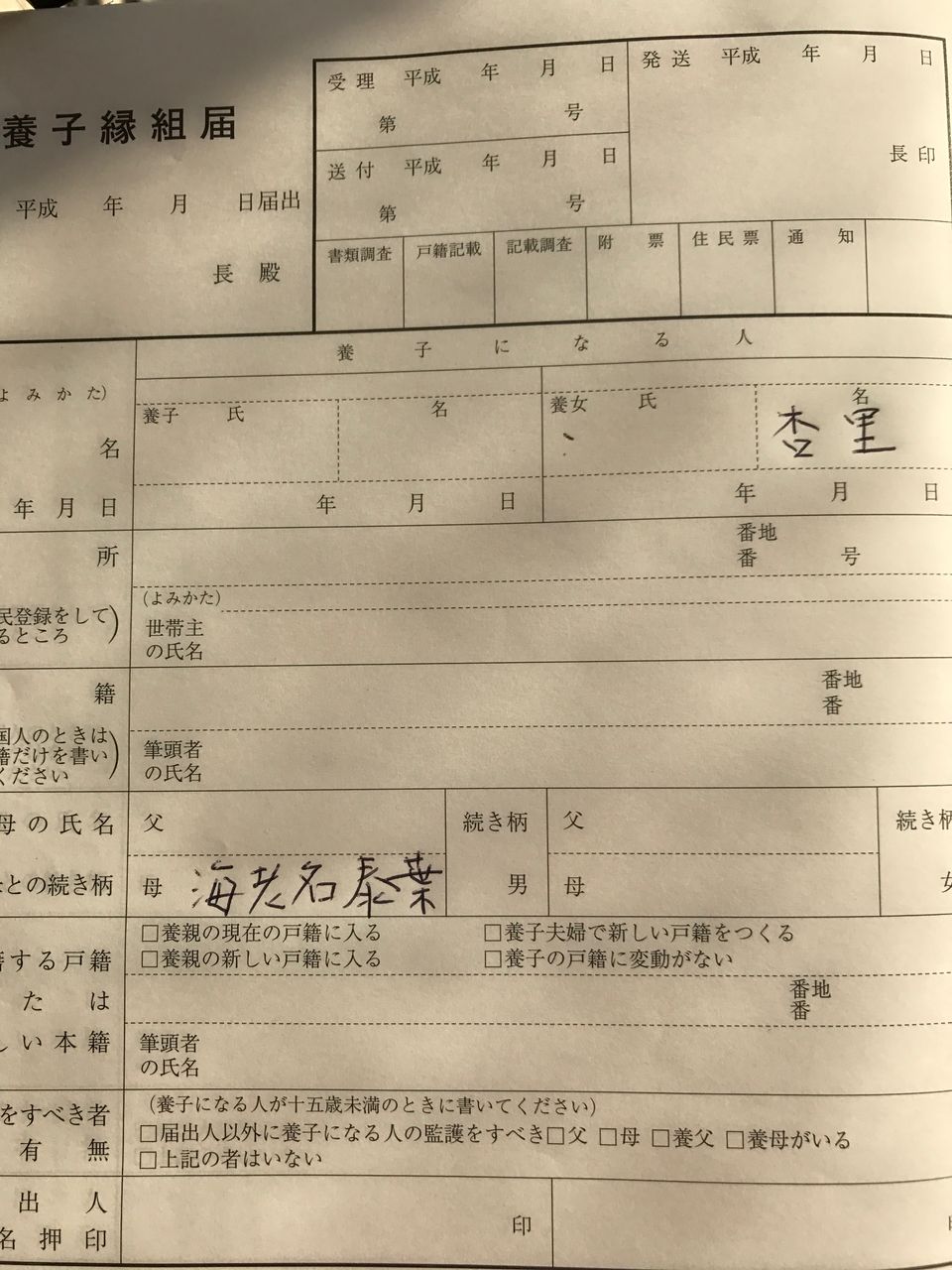 > 区役所に行き養子縁組の書類までもらいました